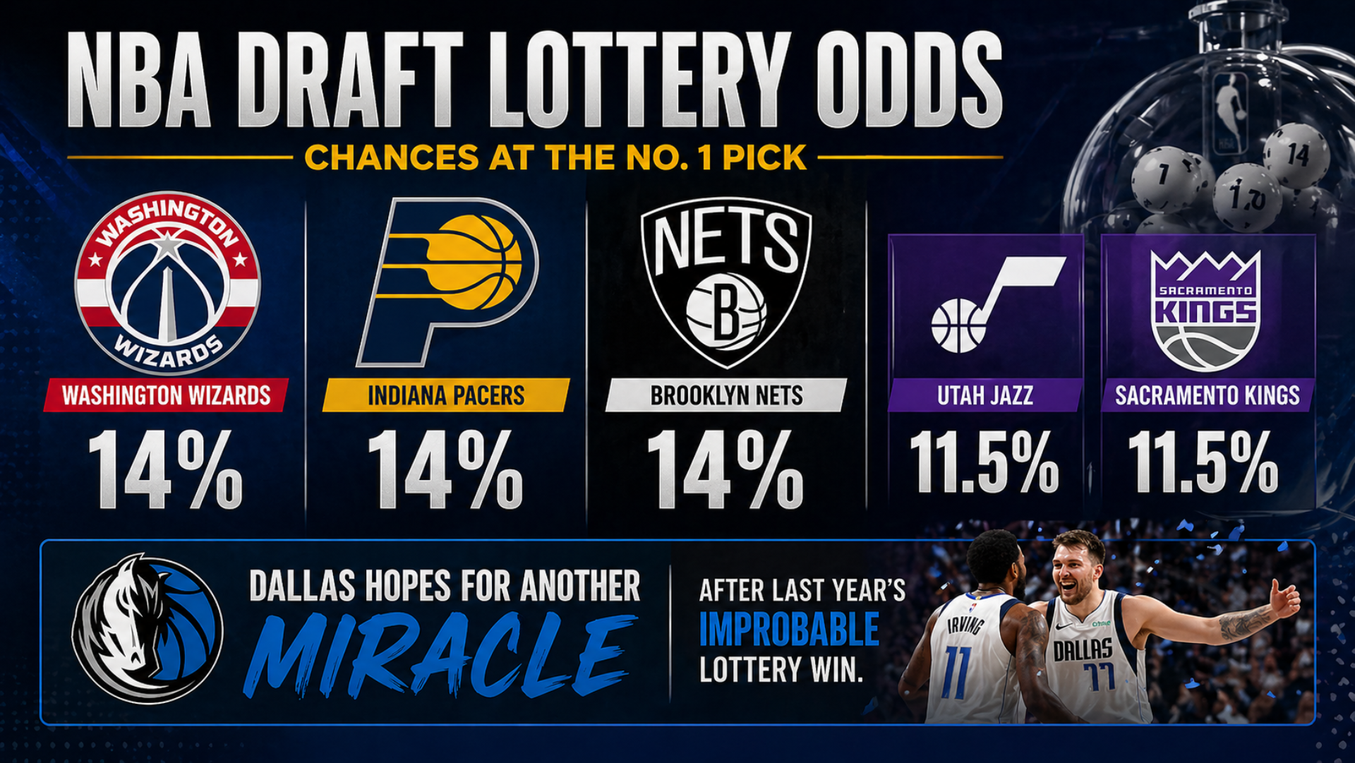 In anticipation of lottery night, the Washington Wizards, Indiana Pacers, and Brooklyn Nets each hold a 14% chance at the No. 1 pick. Utah and Sacramento follow with 11.5%, while Dallas hopes for another miracle after last year’s improbable lottery win. The final lottery order will be set May 10, but the current standings already hint at drama.