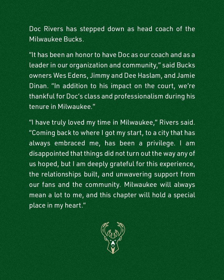 According to sources, Doc Rivers will not return as Milwaukee’s head coach next season. Instead, the franchise and Rivers are discussing a possible move into an advisory role within the front office. The Bucks will still pay him his eight-figure salary for the 2026-27 season.
