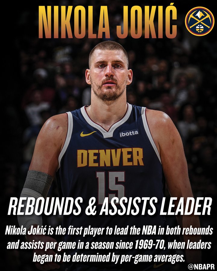 For the first time since 1969-70, an NBA player has led the league in both rebounds and assists per game. That player is Nikola Jokić, the Denver Nuggets’ superstar center. His dominance across the stat sheet places him in rare company.