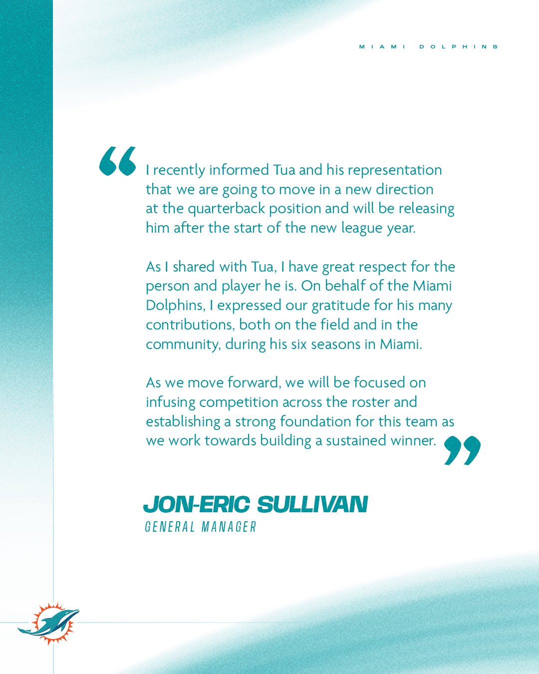 “I recently informed Tua and his representation that we are moving in a new direction at quarterback and will release him after the start of the new league year,” Sullivan added.